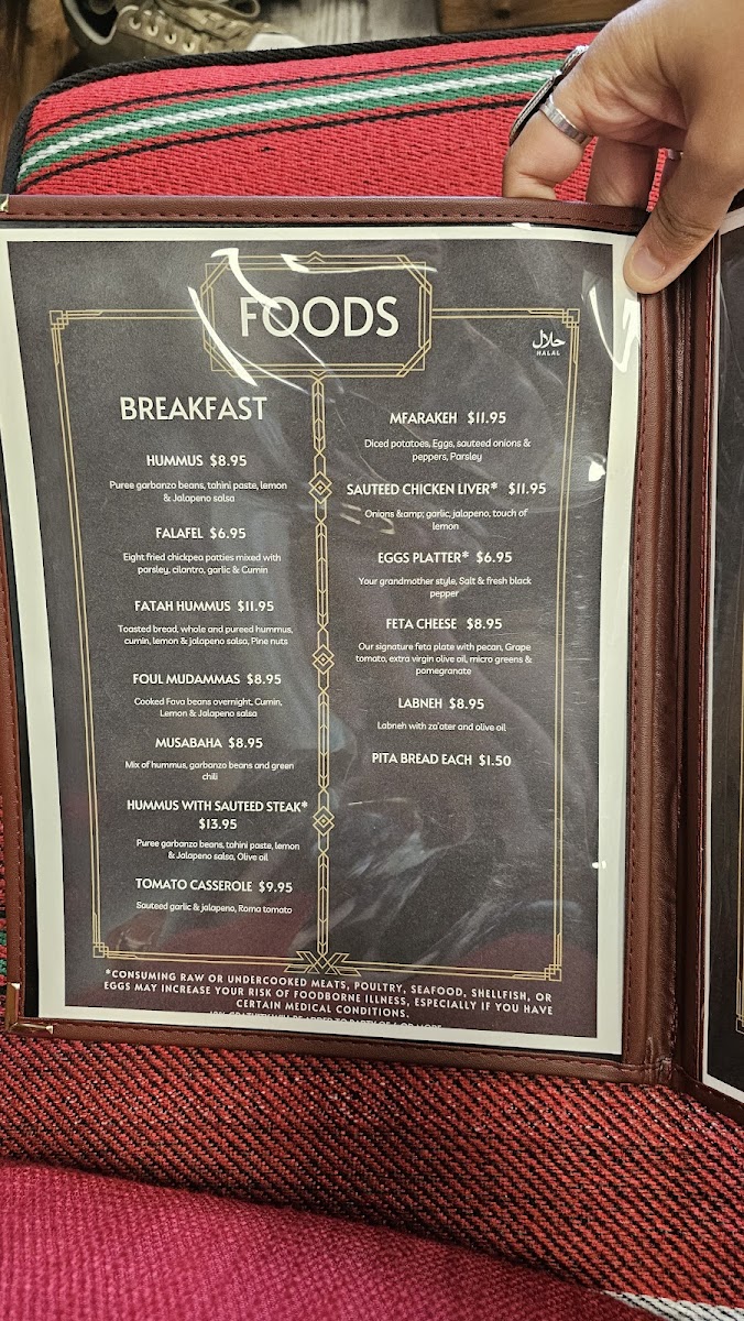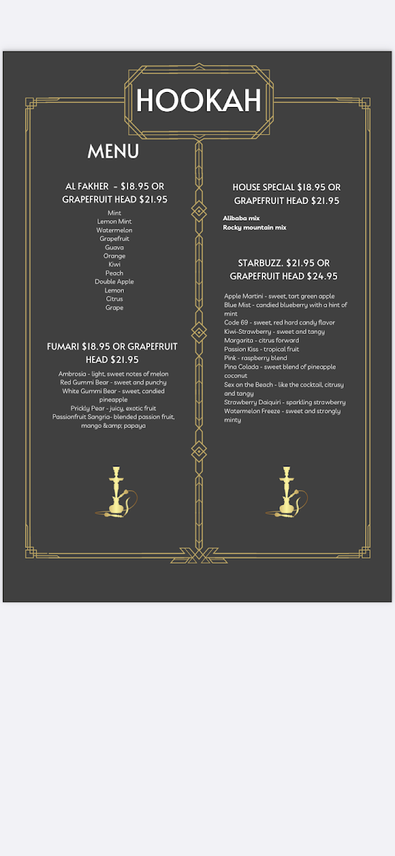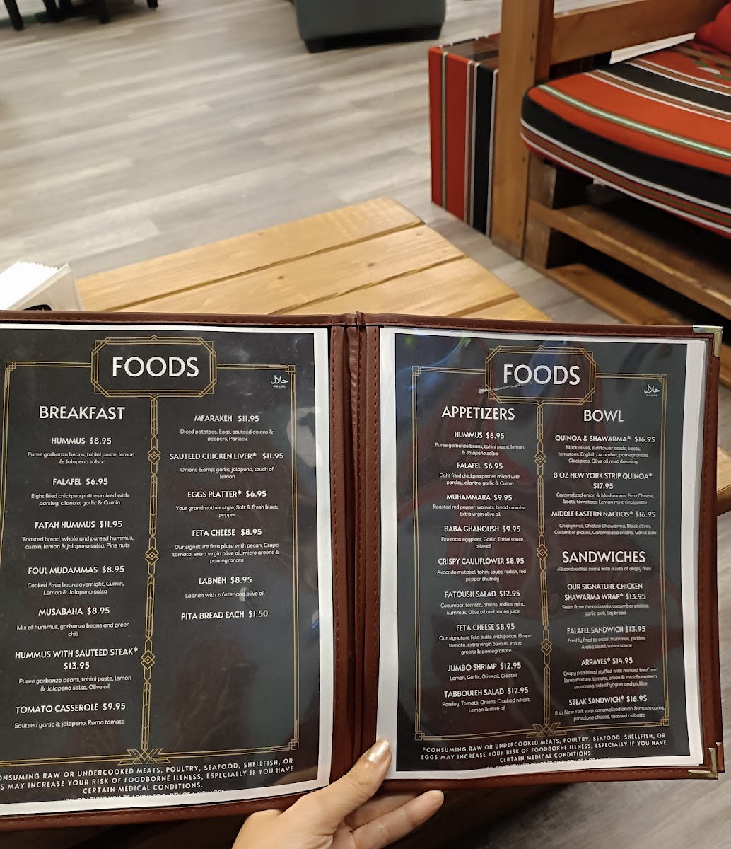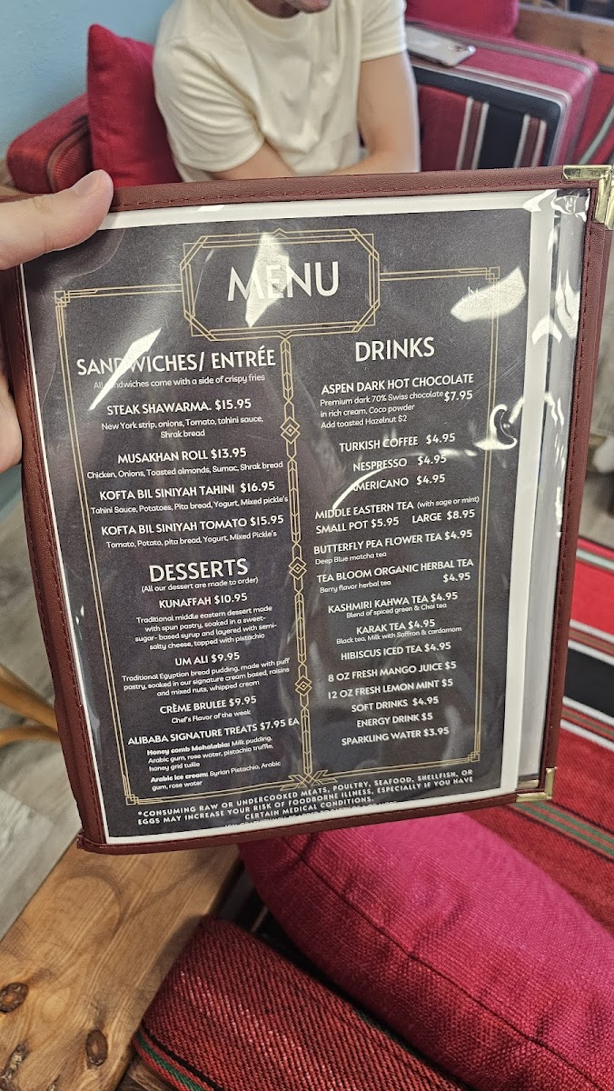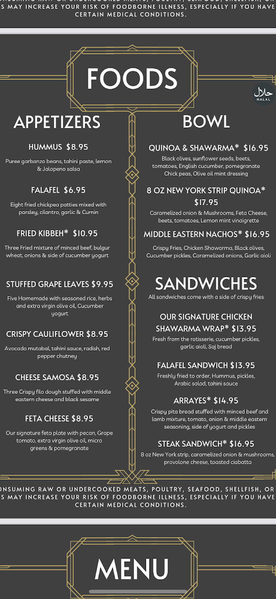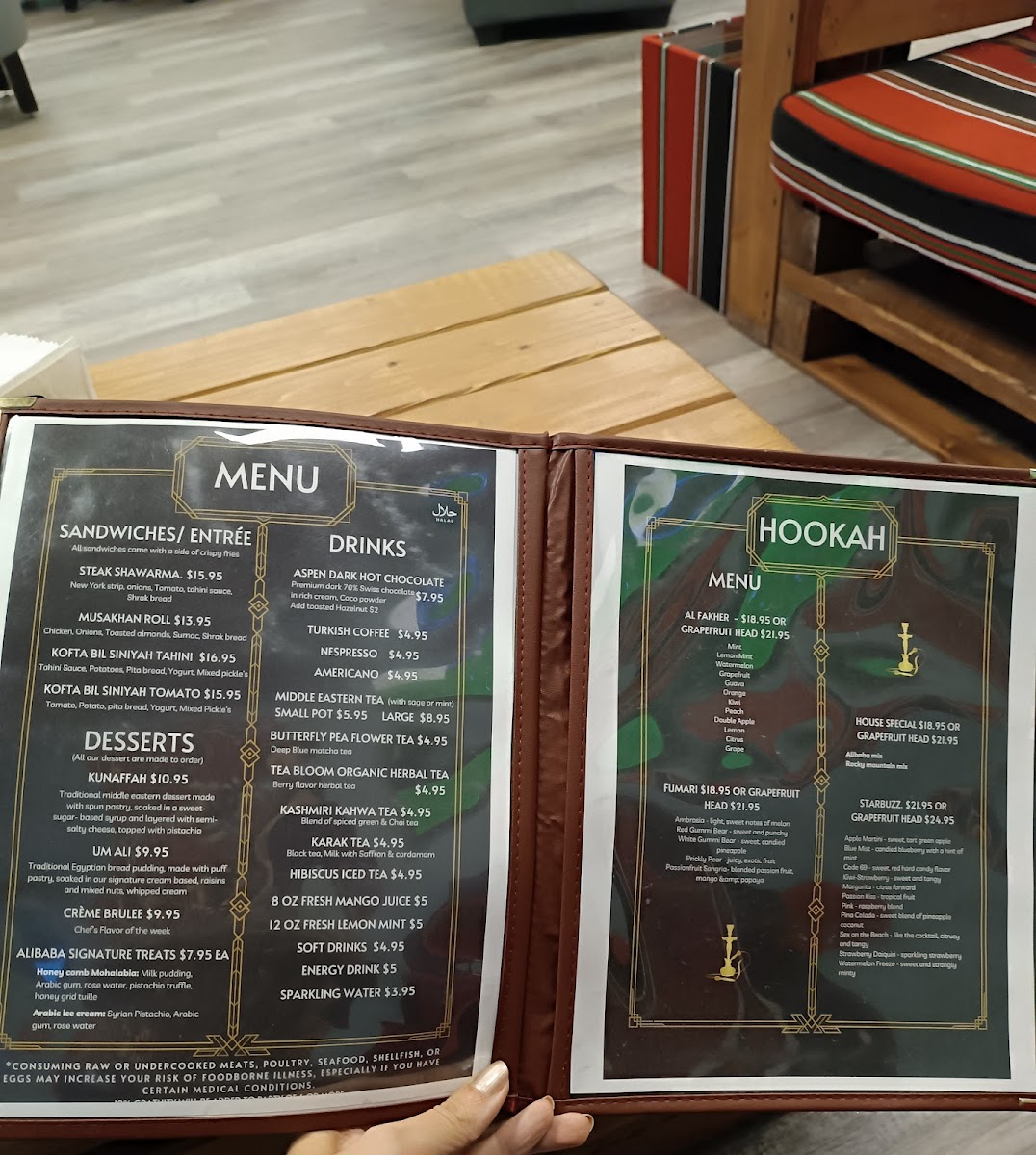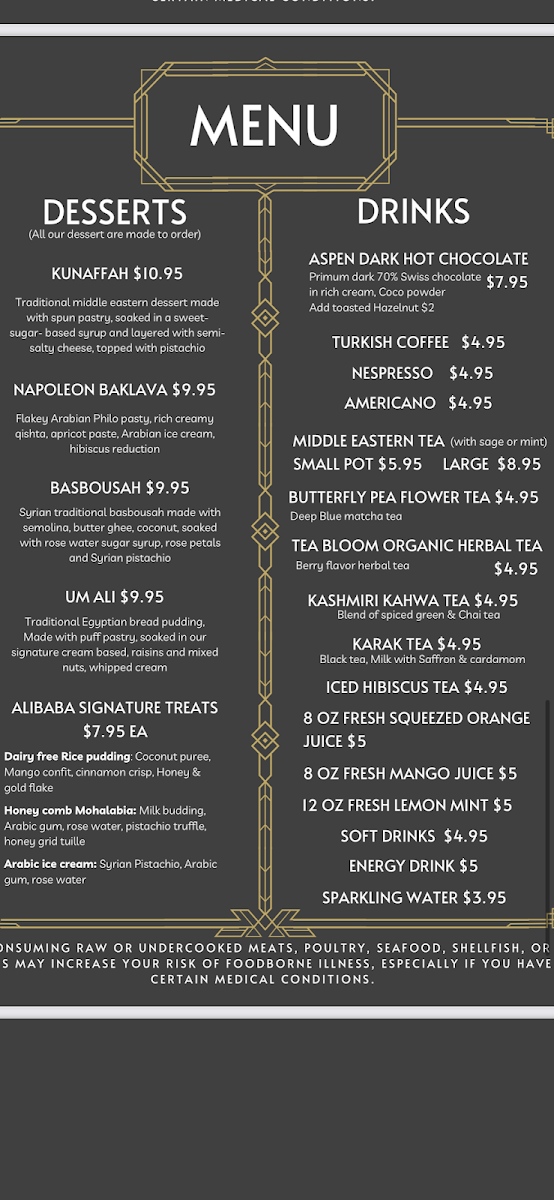 From a reviewer’s perspective, the menu at Alibaba Restaurant & Hookah Lounge feels like a thoughtful wrap-up of Middle Eastern comfort and variety, bringing together familiar favorites and house specialties in a balanced way. The Sandwich selection, including Tushka Chicken, Steak Sandwich, Shawarma Sandwich OnlyArrayes, and Chicken Sandwich, sets a casual yet satisfying tone. Moving into heartier options, bowls such as Middle Eastern Nachos and Chicken Shawarma Bowl offer layered flavors, while breakfast plates like Foul Mudammas, Egg Platter, LabnehTomato Casserole, and Musabaha highlight traditional morning staples with authenticity. The Entree section rounds out the experience with crowd-pleasers like Chicken Tenders W/ Fries, Chicken Wings, and more elevated dishes such as Branzino On Fire and Kufta TahiniKuftaTomato. Lighter starts are well represented by appetizers including Grapefruit Quinoa Salad, Tabbouleh Salad, Arugla Salad, Falafel Appetizer, and Crispy CauliflowerFalafel Appetizer, while sides like Mixed Veggies, RiceAdd Shawarma, Add Steak, and Pita make customization easy. To finish on a sweet note, desserts such as Um Ali, Kunafeh, Arabic Ice Cream, Honey Comb MohalabiaPumpkin Cheesecake deliver classic indulgence, complemented by refreshing drinks like Vimto, Mocktail Berry Blast, Kashmiri Kahwa TeaMocktail Berry Blast, Energy Drink, and Water. Overall, the menu feels cohesive and complete, leaving diners with a clear sense of the restaurant’s identity and a satisfying conclusion to the dining experience.